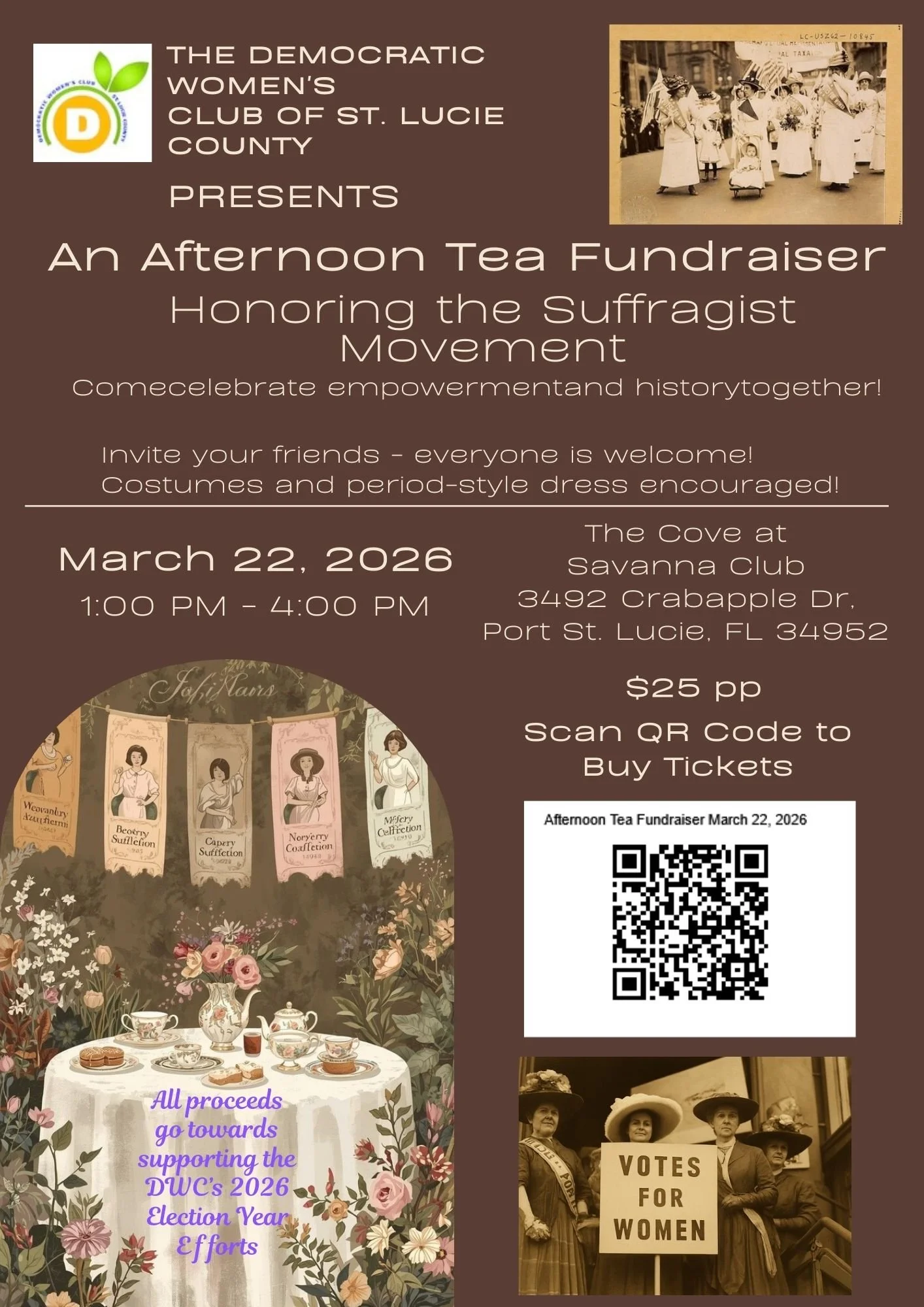 Join the Democratic Women’s Club of St. Lucie County for a Suffragette Tea to raise money for 2026 election year efforts. Tickets available for purchase until March 15th.