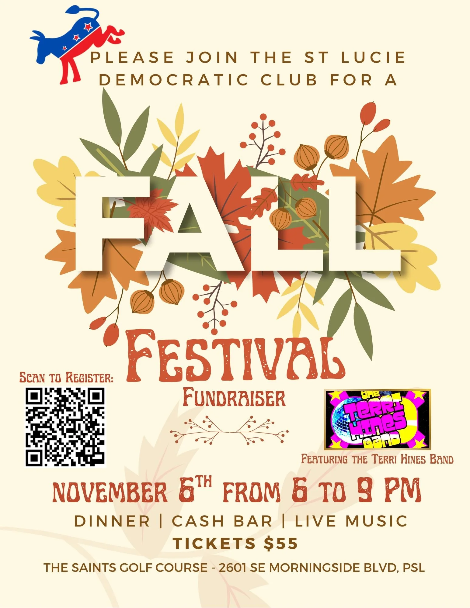 St. Lucie Democratic Club Fall Festival Fundraiser Thursday, November 6, 2025 6:00 PM 9:00 PM Google Calendar ICS Get Tickets