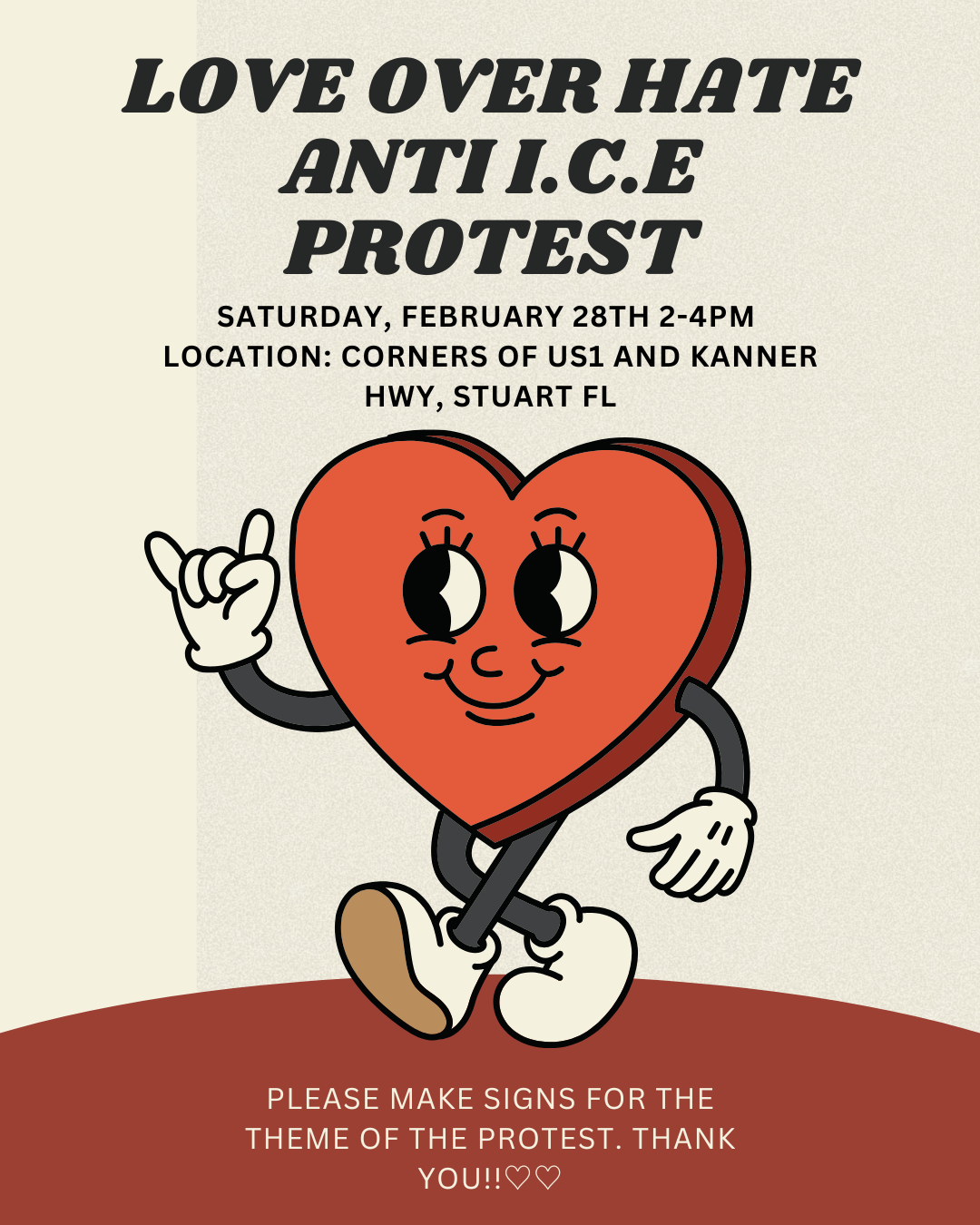 Back to All Events Love Over Hate Anti-ICE Protest Saturday, February 28, 2026 2:00 PM 4:00 PM Google Calendar ICS RSVP